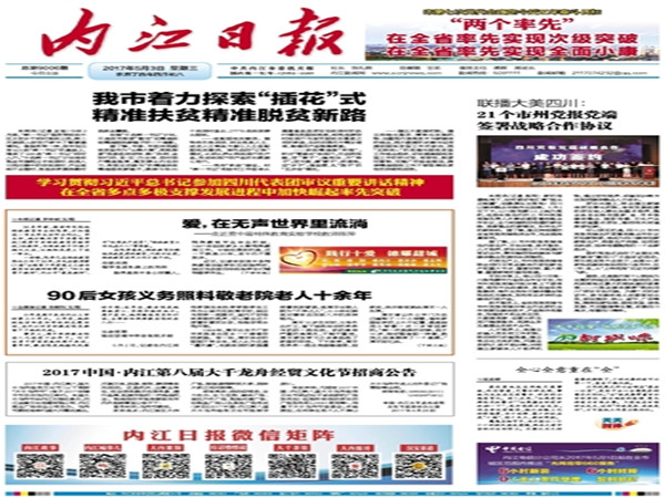 今年3月29日晚,我校2016年“十大学雷锋学生标兵”颁奖典礼在东区礼堂隆重举行。我院14级1班周平成功获选,并在班级晚会上分享了义务敬老路上遭受的重重阻碍,以及那些支撑自己一往无前的温暖和感动。学校和学院对周平同学的先进事迹进行广泛的宣传报道,近日,内江日报记者慕名前来对她进行专题采访,并在5月3日的内江日报“践行十爱 德耀甜城“专栏中“以90后女孩义务照料敬老院老人十余年”为题在第1、3版大篇幅地进行报道。