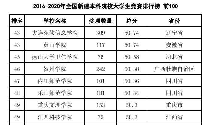 3月22日,中国高等教育学会高校竞赛评估与管理体系研究工作组发布2020全国普通高校大学生竞赛排行榜,其中本科院校榜单13个、高职院校榜单10个、省份榜单3个。我校在2016-2020年全国新建本科院校大学生竞赛排行榜(前100)中排名第47位,四川省内排名第2位。四川共有4所新建本科院校入围(成都工业学院33,内江师范学院47,乐山师范学院48,成都理工大学工程技术学院52)。本次排行榜中纳入竞赛项目共57项。