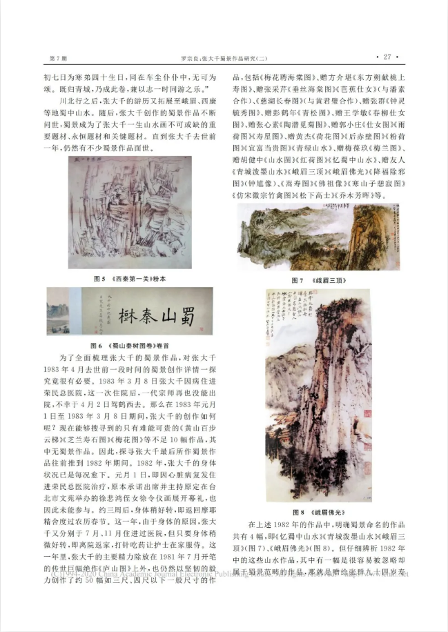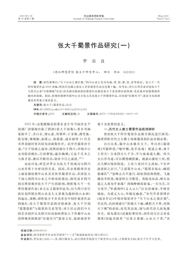 《张大千蜀景作品研究》(一、二、三、四)连载于“全国高校社科期刊特色栏目”《内江师范学院学报》“张大千研究”特色栏目。该作品以蜀人张大千描绘四川山水为主线,讲述四川故事,传播四川声音,展示四川形象,体现中华民族艺术精神,并针对四川山水、川籍画家、四川文旅等四川原创元素提出有关“文旅大省”的建议,对助推“治蜀兴川”具有建设性意义。