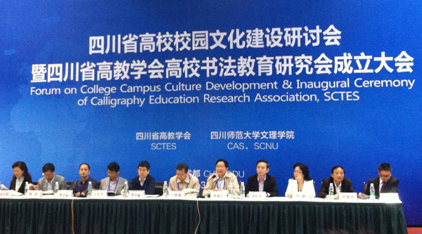 大会由四川省高教学会主办,四川师范大学文理学院承办。会议由四川省高教学会常务副会长唐朝纪教授主持,四川师范大学文理学院党委书记高华锦、院长唐小林分别作了热情洋溢的讲话,介绍了该校校园文化建设和书法教育所取得的巨大成就,赢得与会高校领导专家学者的共同赞赏。会上举行了书法作品赠送仪式和四川省高教学会书法教育研究会授牌仪式,与会代表参观了四川师范大学文理学院书画文化长廊,现场观看了学生校园文化建设成就汇演。