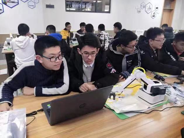 图为青岛二中学生正在人工智能实验室开展培优学习
