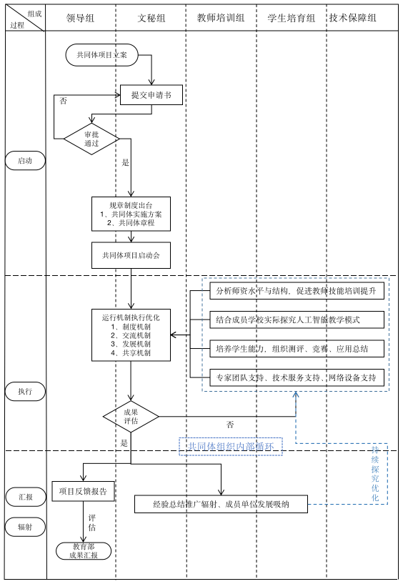 在实施过程中,项目组设立五个工作小组,由领导组、文秘组整体布局,教师组、学生组、技术组协同推进。经过不懈的努力和探究,形成了包括启动、执行、汇报、反馈、辐射的一套完整的运转流程(如图1所示);建立了制度、交流、发展、共享机制,实施师生交流常态化,区域发展多元化,资源共享系统化;汇聚了一批成熟的、可借鉴、可推广的人工智能课程教学典型案例;打造了一支高水平的专业的人工智能骨干教师队伍;梳理了1-3年级基于兴趣的启蒙式教学、4-6年级基于项目式学习的普及教学、7-9年级基于学科整合与社团课程的项目实践教学、高中学段基于个性发展的探究式学习等四类教学应用模式,以及基于教育教学和教学管理两个层面的赋能应用模式;创建了包括教学教案、导学案、教学课件、教学视频、知识图谱等内容的人工智能教育基础资源库;编制了《人工智能教育评估方案》,对学生人工智能的理解与应用进行综合评估。