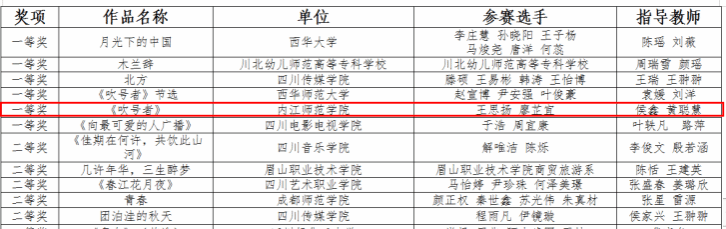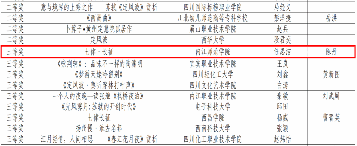 近日,四川省2023年中华经典诵写讲演系列活动获奖名单公布。我院辅导员梅婕、青年教师侯鑫参与的作品荣获“诵读中国”教师组三等奖;青年教师任思洁的作品荣获“诗教中国”大学教师组三等奖;学生王思扬、廖芷宜的作品荣获“诵读中国”大学生组一等奖;学生裴扬扬、肖瑞君的作品皆荣获“诗教中国”大学生组三等奖。