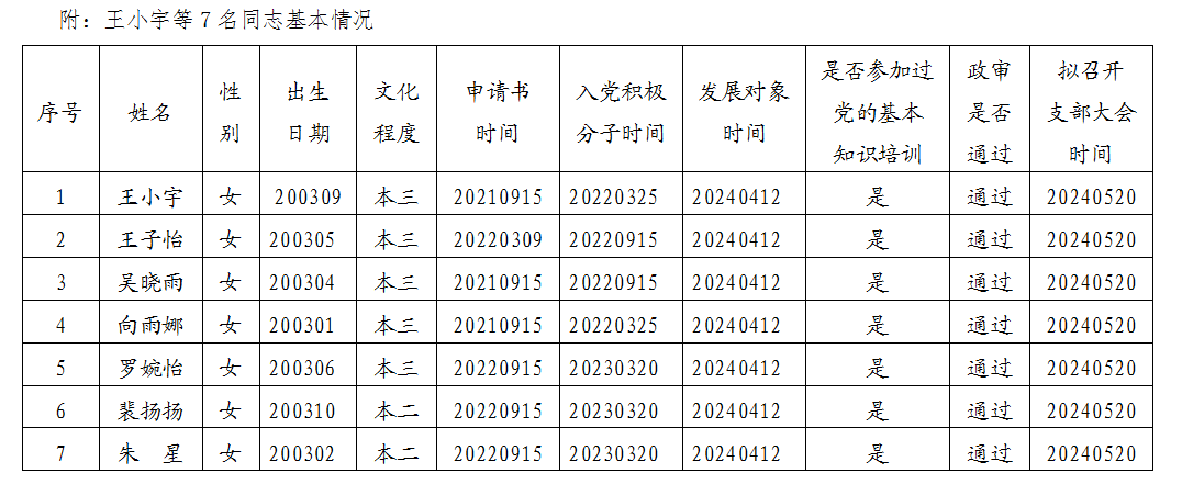 根据本人申请、组织培养,本支部经研究拟发展王小宇等7名同志为中共预备党员。为广泛征求党内外群众意见,决定自2024年05月13日起予以公示(至少5个工作日)。如对公示对象有不同意见,请于公示日内,以口头或书面形式向本支部或范长江新闻学院党委反映。