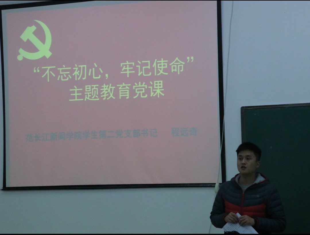 会议众,学生党支部书记程远奇主持了“不忘初心牢记使命”主题教育党课,重点强调了理论学习要有收获、思想政治受洗礼、干事创业敢担当、为民服务解难题、清正廉洁做表率等各方面内容要求。并且观看了《初心之路》第一书记周永开的相关事迹视频,视频里报道了离休干部、共产党员周永开不改为民本色,用行动践行对党的忠诚的先进事迹。而到场的同学们会继续关注周永开一辈子坚守初心、不改本色的感人事迹。