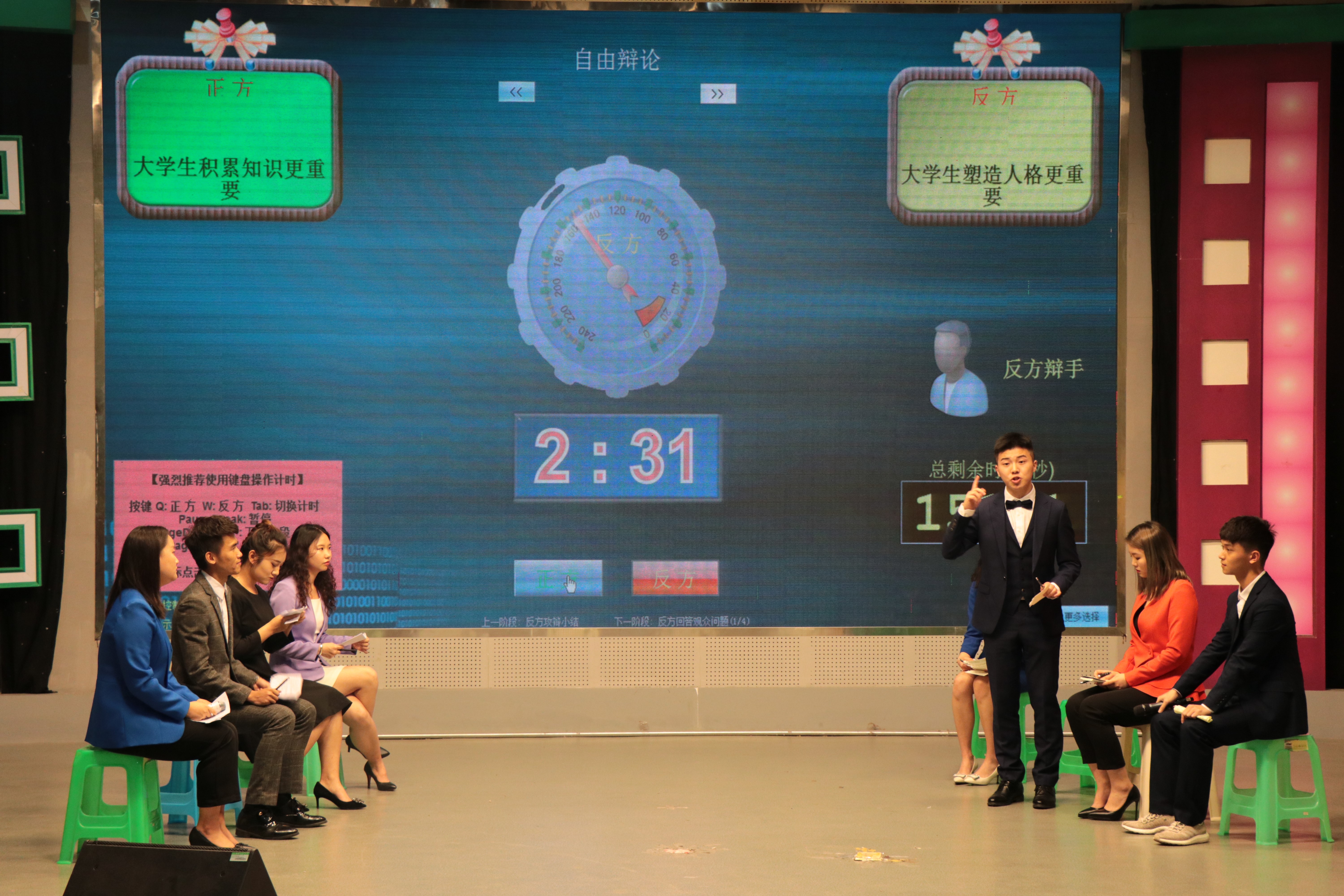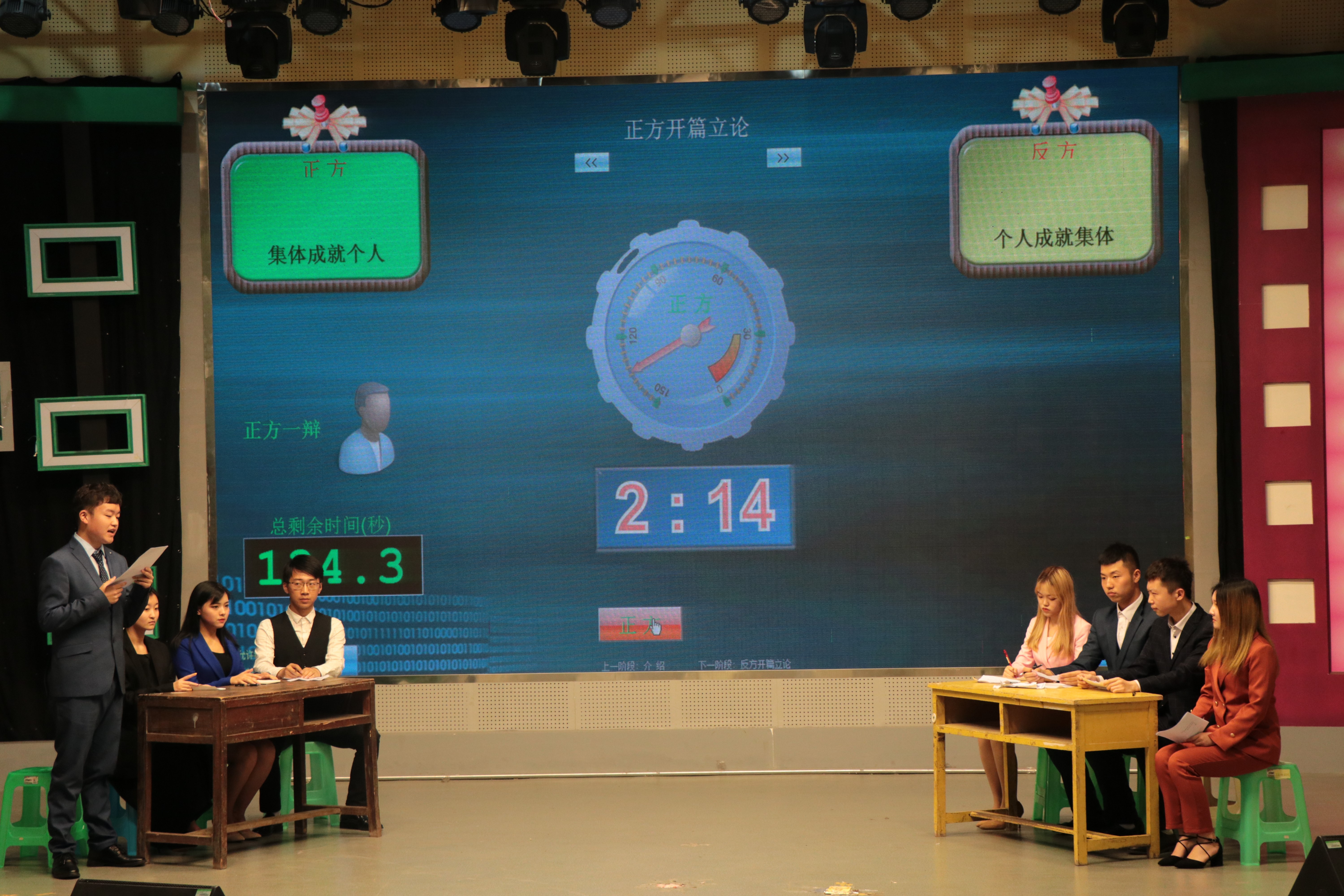 第三项表演为精彩激烈的辩论赛,本次辩论赛共两组。第一组同学以“大学生积累知识更重要还是塑造人格更重要”为辩论题目,第二组同学以“集体成就个人还是个人成就集体”为辩论题目,两组同学从自身辩题与生活经历的角度展开辩论。比赛过程中,两组同学做了充分准备,并且遵守比赛规则,积极提问、踊跃发言。在最精彩的自由辩论环节中,现场气氛迅速升温,整个赛程高潮不断,掌声此起彼伏。