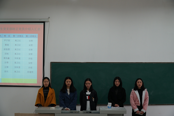 会议伊始,学生党支部书记宋秋莹、刘丽娜分发预备党员资料袋和成绩单并介绍大会议程。这次会议主要有五项议程:一是预备党员汇报预备期间的思想、工作情况;二是入党介绍人介绍该同志在预备期间的表现情况和表明意见;三是支部委员会介绍该同志预备期间的教育考察情况;四是与会党员发表意见,对该同志能否转正进行充分讨论;五是无记名投票表决。18名预备党员依次汇报本人情况。入党介绍人也对预备党员进行在校情况汇报。通过支委会审查,与会党员进行无记名投票。经过两名计票人统计,两名监票人监督,最终结果为全票通过预备党员刘怡、王娜等16名同志按期转正,2名同志延长预备期半年。会议最后,学生党支部书记宋秋莹、刘丽娜带领党员重温入党誓词。