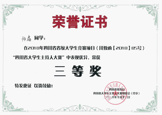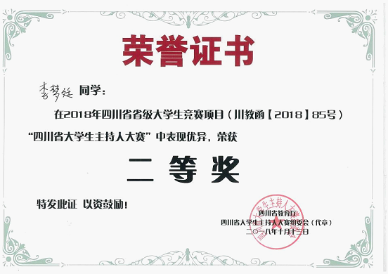 10月13日,由四川省教育厅主办、西华师范大学和四川音乐学院承办的2018年四川省大学生主持人大赛复赛在西华师范大学落幕。本次比赛中,范长江新闻学院三名同学表现优异,其中李梦廷获专业组二等奖,付霆樾、帅鑫获专业组三等奖,范长江新闻学院获优秀组织奖。