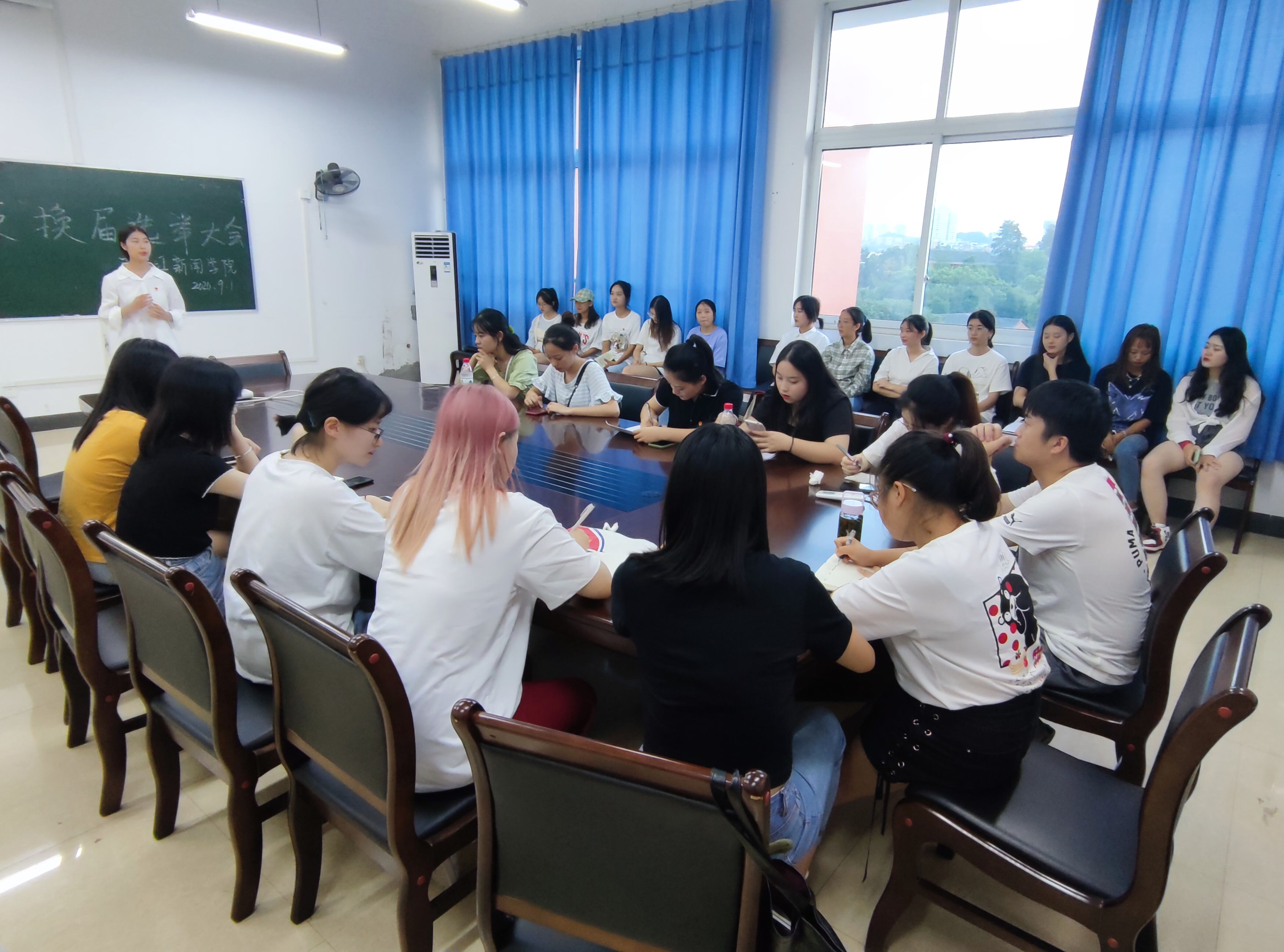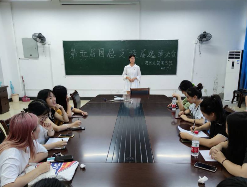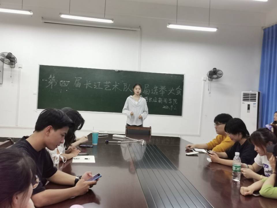 9月2日晚7点,我院在第三实验教学楼412召开了第五届团总支学生会暨第四届长江艺术队换届选举大会,辅导员宋秋莹、程远奇参加此次大会。