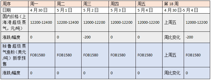 4月28日—5月4日(第18周),本周秘鲁本季中北部捕鱼量已经突破百万关口,当地鱼粉厂商在之前批量销售之后心态存在差异,报价波动暂有限,成交则仍以议价为准;同时,对于我国鱼粉市场而言,随着港口到货量趋于上升,我国鱼粉持货商销售心态依旧承压,令报价继续回调。本周国内主要港口和秘鲁市场的报价水平分别如下: