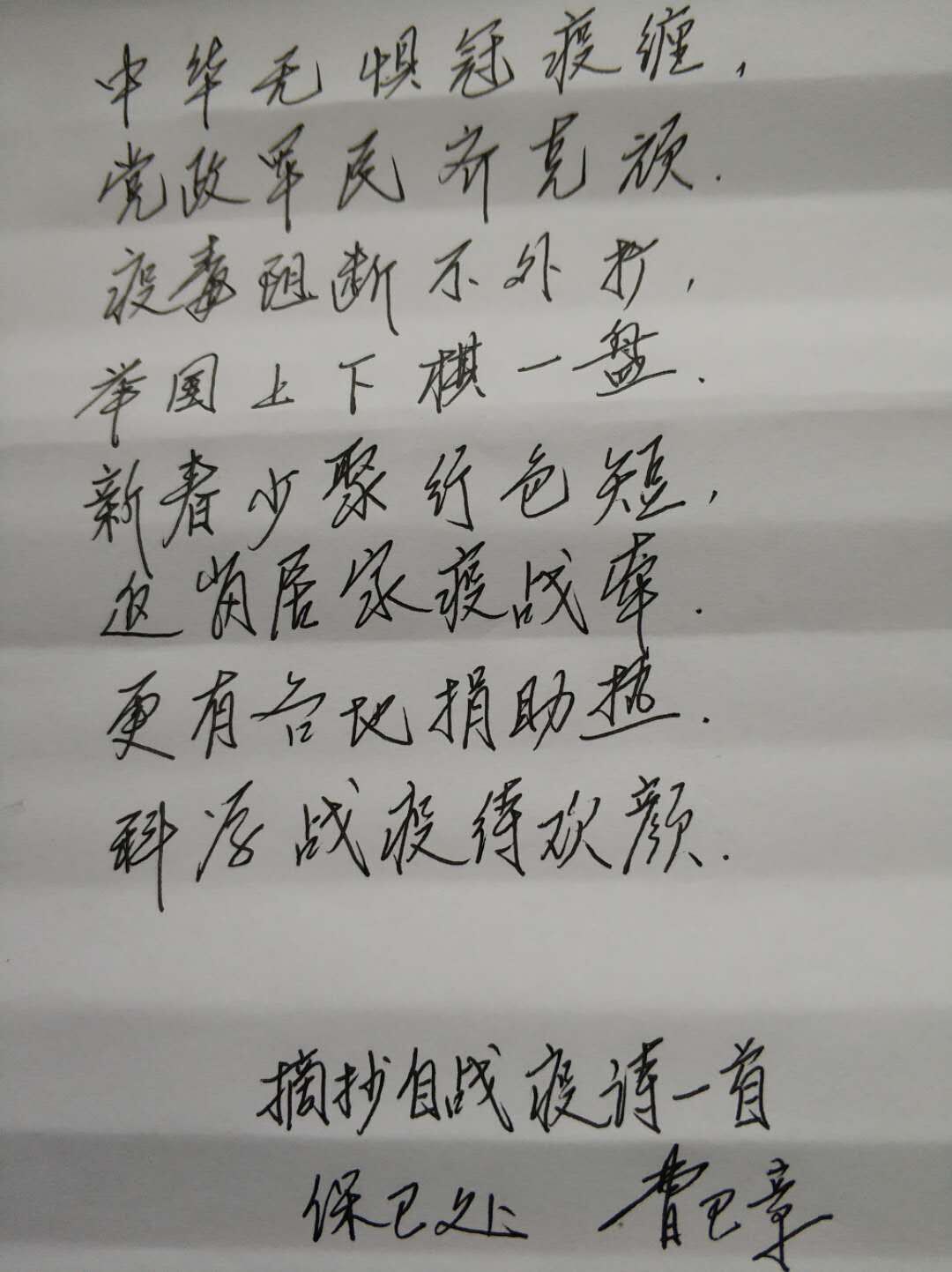 在书法比赛中,女职工们书写了一大批主题书法作品。“春风杨柳万千条,六亿神州尽舜尧”,“中华无惧冠疫缠,党政军民齐克顽”,“山河无恙、幸得有你”,“最美逆行者,最赤中国心”,一句句祝福,一首首赞歌,是老师们发自内心对“抗疫”英雄的赞美和崇敬,在这个特别的时期更具有教育意义。经过线上投票评比,选出了一等奖(2名)、二等奖(4名)、三等奖(10名)。