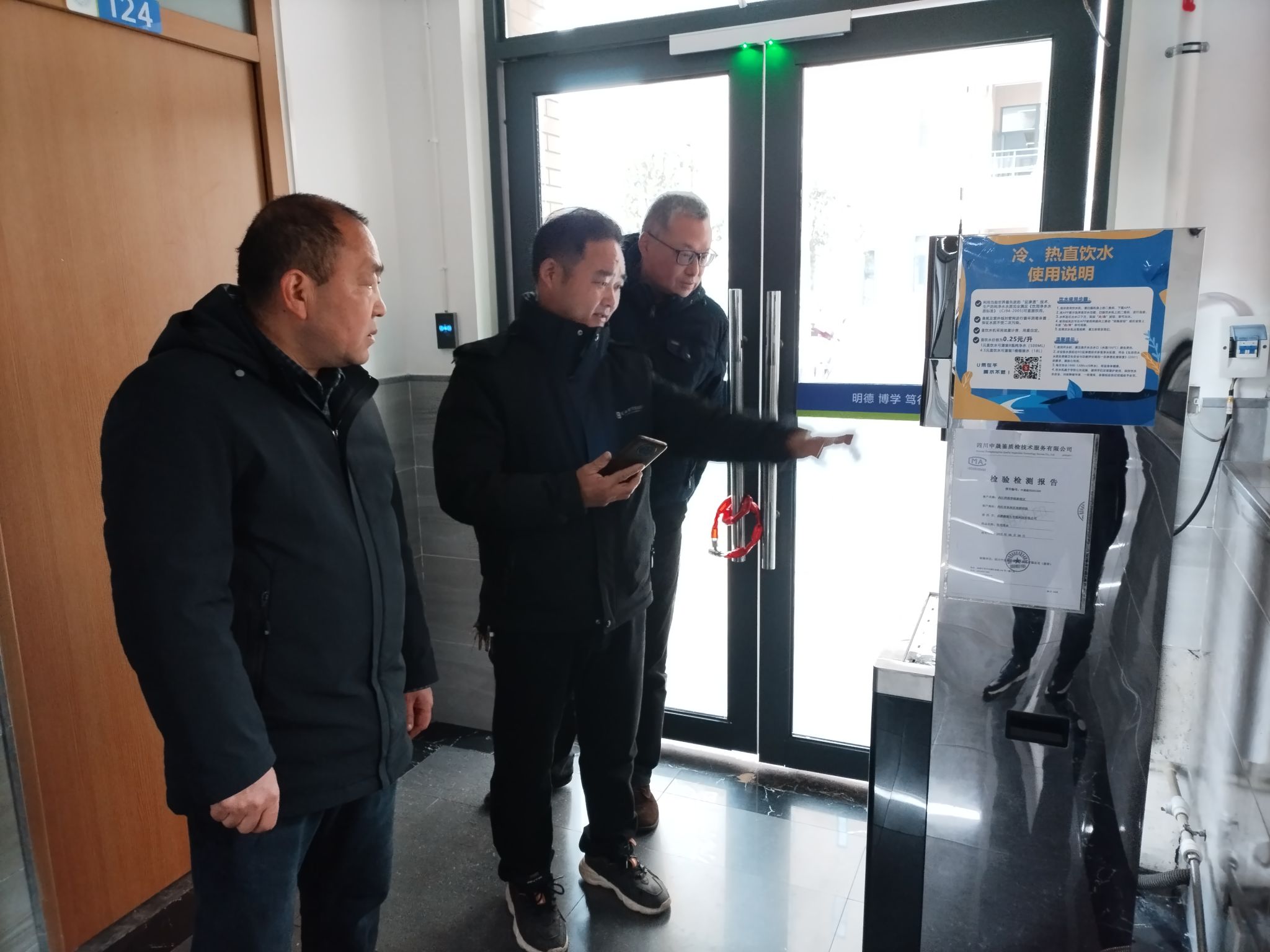 在学生公寓,检查组详细了解了热水直饮水设备的运行情况,并抽样试温检查,确保开学季学生热水直饮水的正常使用,保障饮水安全。