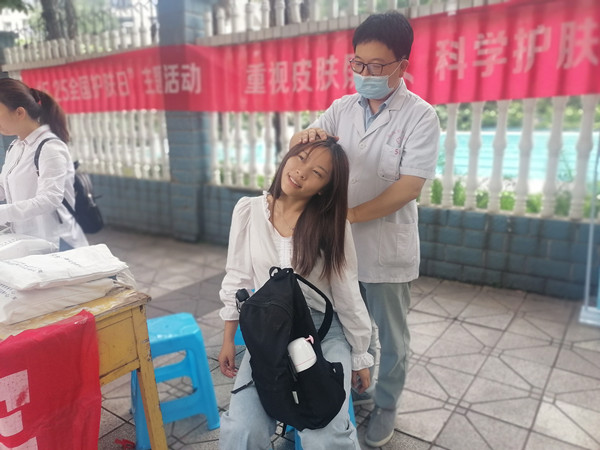 上午8点30分,专家们准时到达学校。活动现场已有师生等候,大家有序排队,依次询问。有的同学出现颈椎部位疼痛,手指麻木的症状;有的同学眼睛视力不佳,视觉容易出现疲倦;有的同学运动后扭伤、带有旧疾一直未愈;有的同学满脸青春痘,皮肤带有坑印、瘢痕……问题层出不穷,医生们耐心解答,给出解决方案。