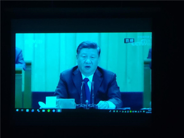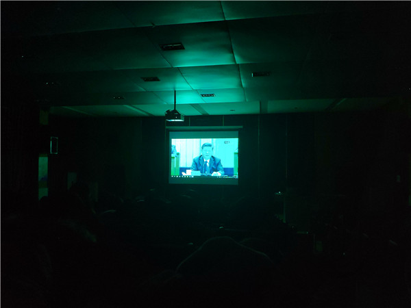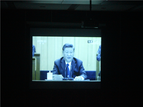 会议开始,直奔主题,播放了改革开放第四十周年大会视频。视频中,习近平总书记首先回顾了历史,通过历史,让我们进一步认识到改革开放是我们党的一次伟大觉醒,它铸就了伟大的改革开放精神,且是当代中国人最鲜明的精神标识。四十年来取得的成就不是天上掉下来的,更不是别人恩赐施舍的,只有改革开放才是党和人民踏步赶上时代的重要法宝。改革开放四十年的实践启示我们:方向决定前途,道路决定命运。我们要把命运掌握在自己手中,就要有志不改、道不变的坚定。习近平强调,四十年的实践充分证明,在前进的道路上,我们必须坚持以新时代中国特色社会主义思想和党的十九大精神为指导,增强“四个自信”,牢牢把握改革开放的前进方向。习近平还强调,改革开放已走过千山万水,但仍需跋山涉水,摆在全党全国各族人民面前的使命更光荣、任务更艰巨、挑战更严峻、工作更伟大,我们决不能有半点骄傲自满、故步自封、也决不能有丝毫犹豫不决、必须统揽伟大斗争、伟大工程、伟大事业、伟大梦想,勇立潮头、奋勇拼搏。
