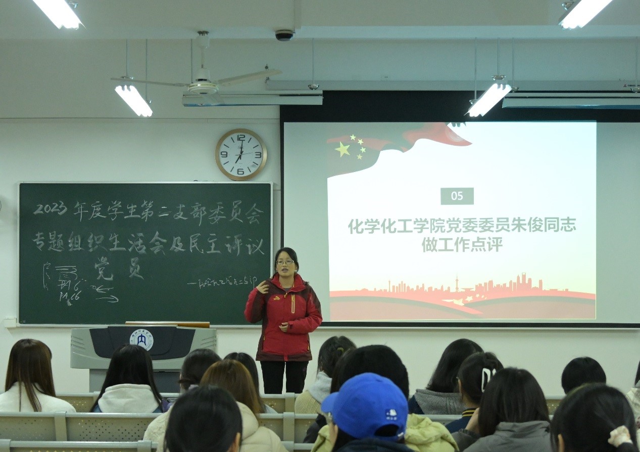 化学化工学院学生第二支部于2023年11月13日晚19:30在明德楼A323召开了2023年专题度组织生活会。会议由支部书记王佳惠主持,支部正式党员请假1名(钟红在外实习),学院党委委员朱俊同志受院党委委托列席了会议,全体预备党员列席了本次会议。