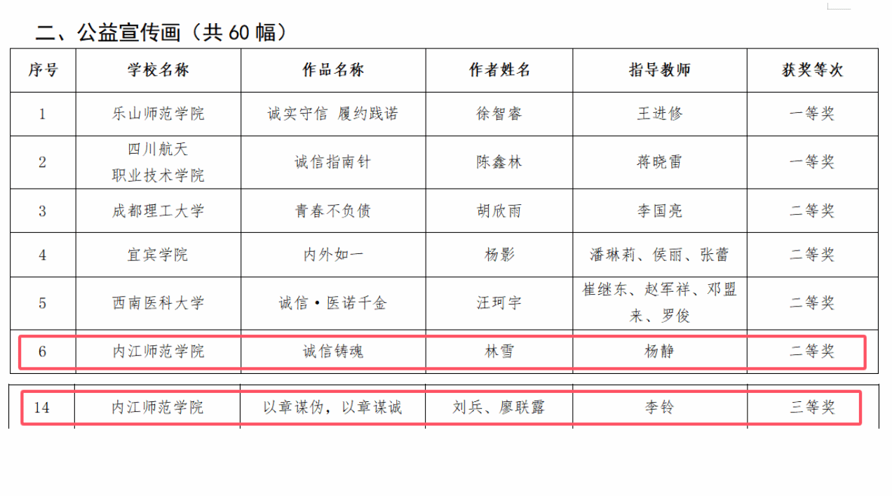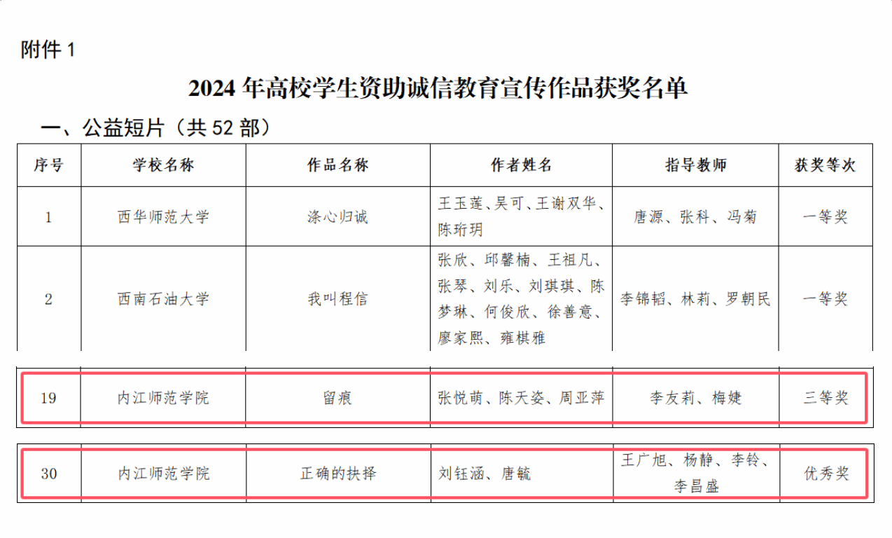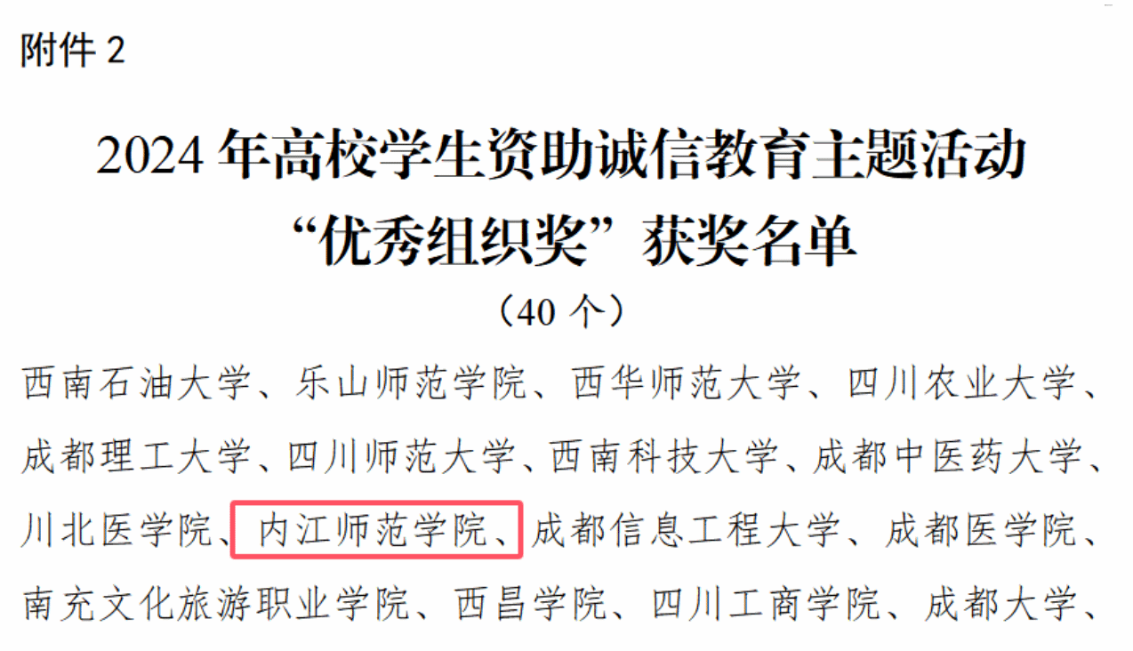 近日,四川省教育厅公布了2024年高校学生资助诚信教育宣传作品获奖名单,我校报送的6个作品中,获二等奖1个,三等奖2个,优秀奖2个,学校获“优秀组织奖”。