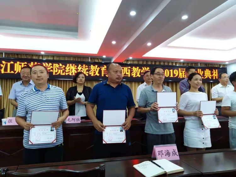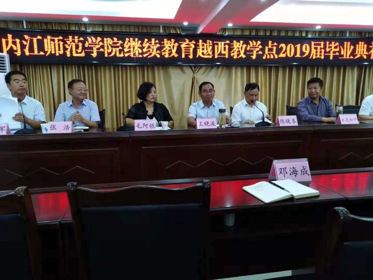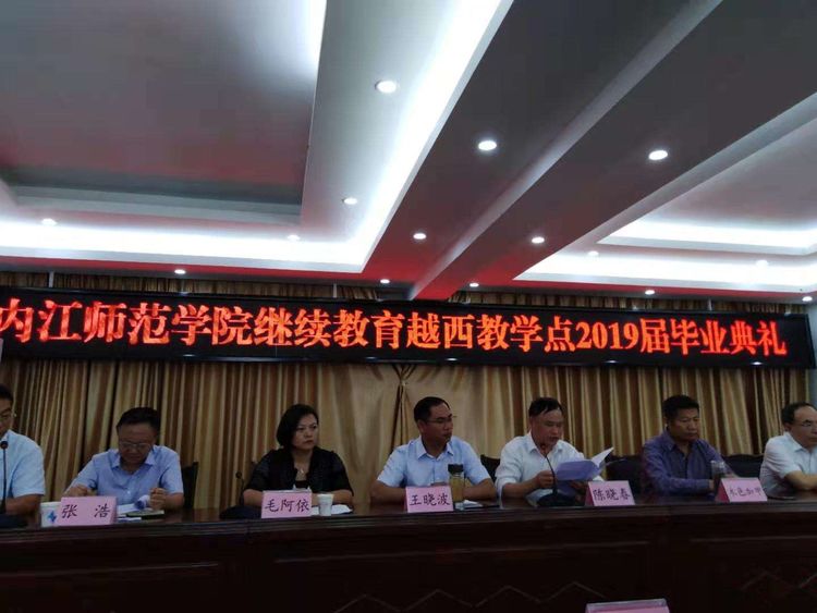 典礼伊始,主席台就坐的领导们为学员们颁发了毕业证书。随后,学生代表孟先林发言,他代表所有学员深深感谢学院、老师的无私付出,表示今后一定加强学习,不断进步,要以优异的工作业绩来报答母校和老师们的培养。越西县政府副县长毛阿依在会上发言,她谨代表越西县委、县政府、教育体育和科学技术局和教育系统的所有工作人员对内江师范学院一行七人的到来表示最热烈的欢迎,充分肯定了师院在越西实施的教育扶贫本科学历免费提升项目对越西教育的促进作用,认为这是“快出人才、出好人才”的重要举措,彰显了师院义不容辞的使命担当,彰显了真情和友情,希望师院增加名额为越西培养出更多的本科生。最后,内江师范学院党委副书记、校长陈晓春发表了热情洋溢的讲话。他强调,为借助高校优势助推贫困地区经济社会发展水平,内江师范学院于2016年开始启动越西县精准扶贫免费学历提升项目,截至到2019年6月30日,师院先后录取4批次越西县(含幼儿园)在职本科学历364人。扶贫先扶智,为全力激发内生动力,真正实现脱贫攻坚,师院将一如既往,力争为越西培养更多的人才。学员们纷纷表示,要感恩母校,感恩教师,加强学习,努力工作,不辜负母校教师的期望。
