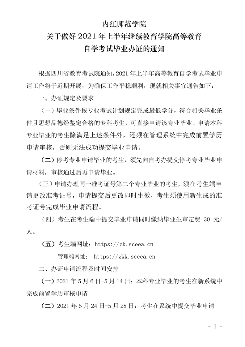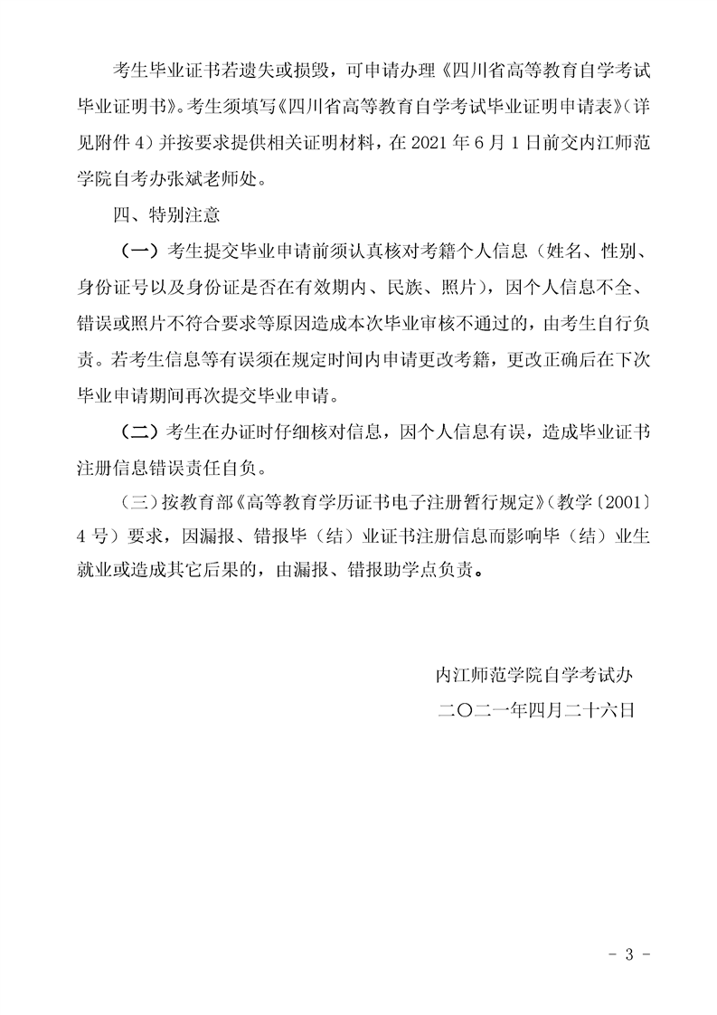 内江师范学院关于做好2021年上半年继续教育学院高等教育自学考试毕业办证的通知