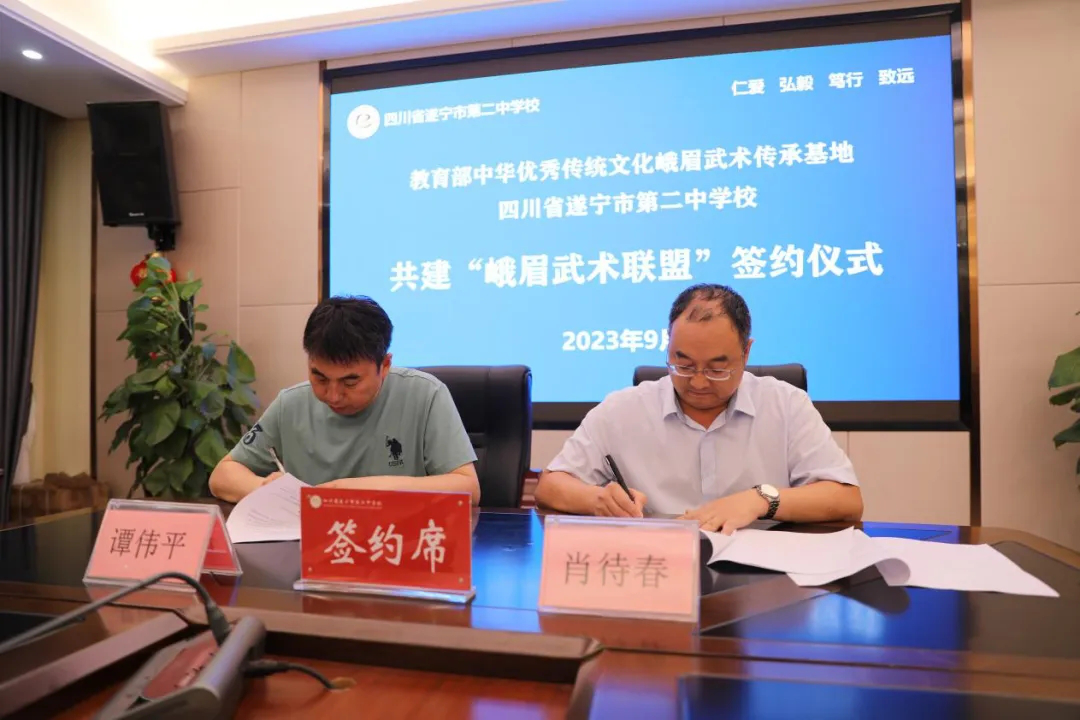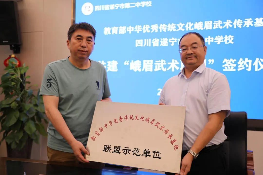 为传承和弘扬峨眉武术文化,加强高校与中学的合作交流,促进峨眉武术在校园的传承和发展,9月13日下午,教育部中华优秀传统文化峨眉武术基地四川省遂宁市第二中学校举行了共建“峨眉武术联盟”合作签约仪式和联盟示范单位授牌仪式。