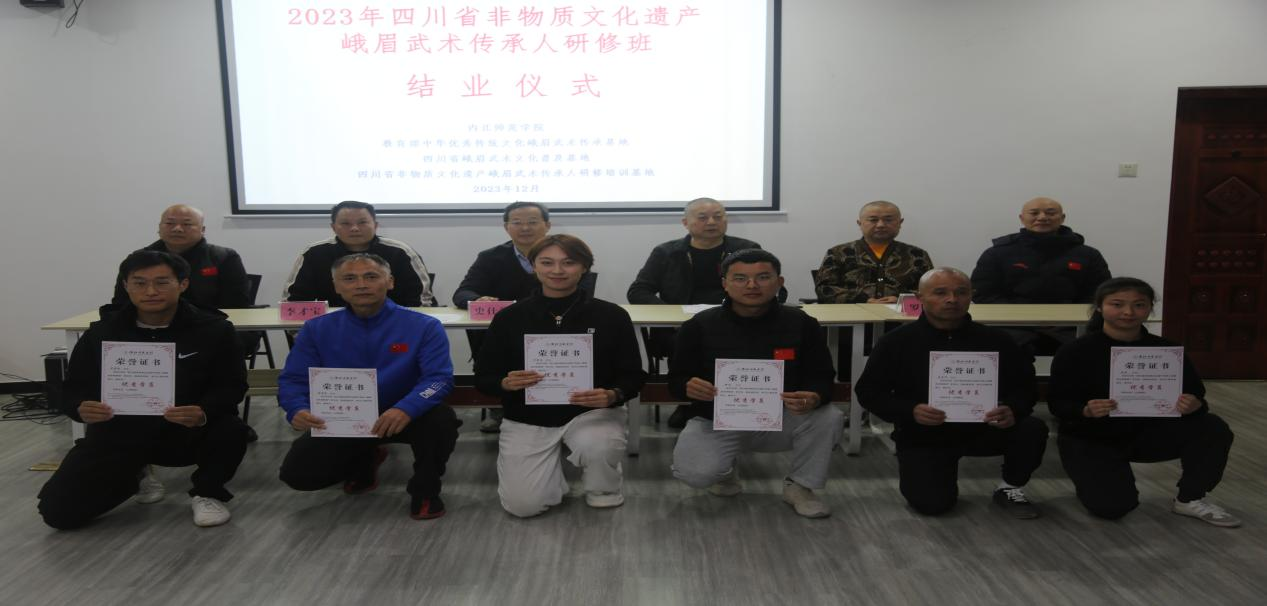 2023年12月6日,经过为期二十一天的紧张学习,由四川省文化和旅游厅、教育厅、人力资源和社会保障厅主办,内江师范学院承办的“2023年四川省非物质文化遗产传承人峨眉武术研修班”在内江师范学院顺利结业。结业仪式由内江师范学院体育学院院长、峨眉武术基地主任谭伟平主持。