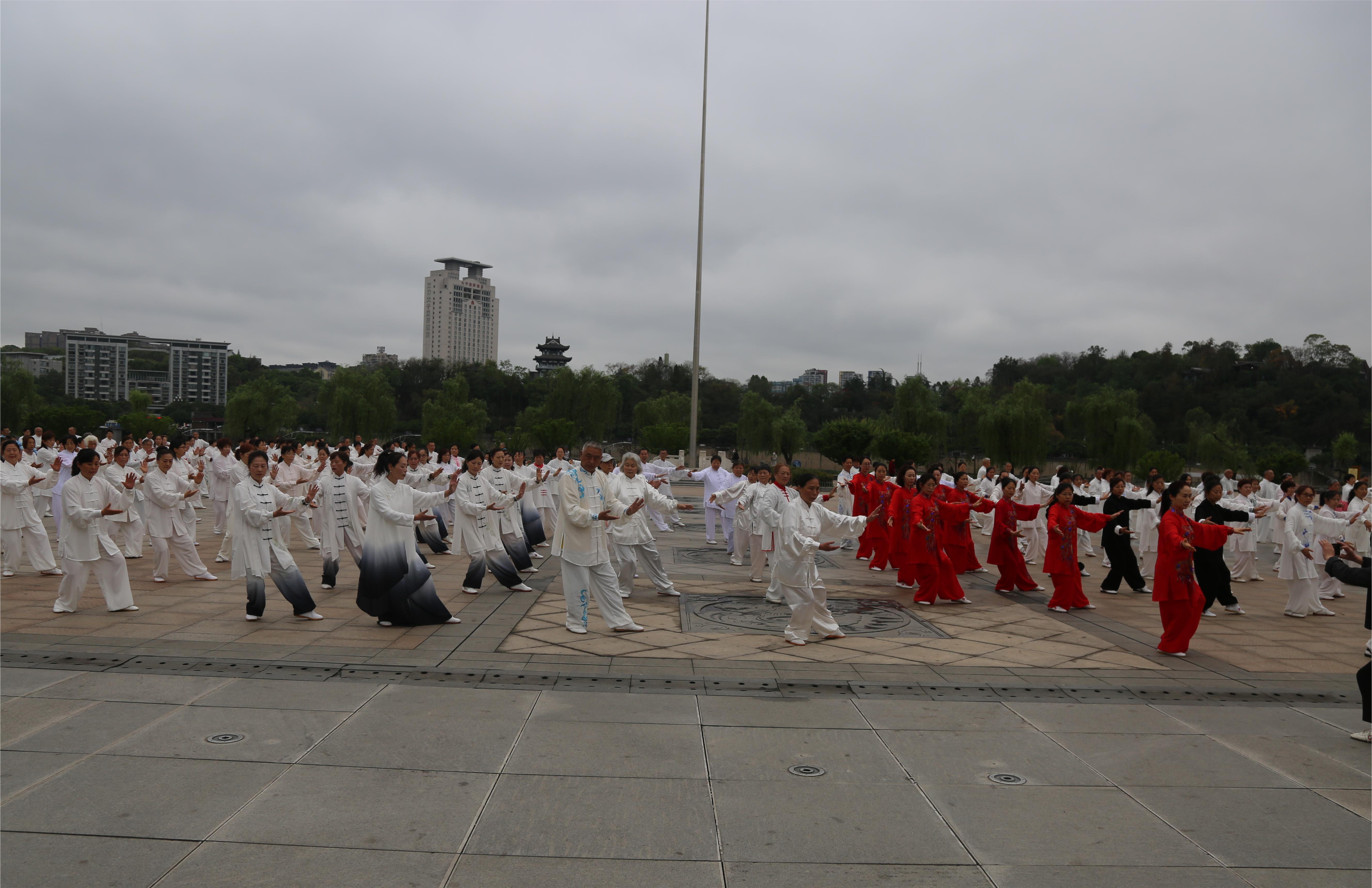 本次活动以“贯彻二十大精神,促峨眉武术文化全面普及”为主题,通过以峨眉武术传统拳术、器械等一系列表演,展示峨眉武术文化底蕴。展演活动以百人太极拳热身表演拉开序幕。接着通过峨眉武术传统拳术、兵器、对练等表演吸引来往人群驻足观看。最后,由峨眉武术基地副主任周勇教授领练的峨眉传统拳术将展演氛围推向了高潮,赢得观众的阵阵掌声与喝彩。