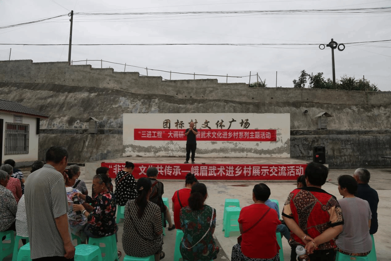 活动开始前,村民们早早聚集在活动场地,期待着这场精彩绝伦的演出。四川省社会科学峨眉武术文化普及基地的学生与观众进行互动,拉近了与观众间的距离,增强了演出的氛围。