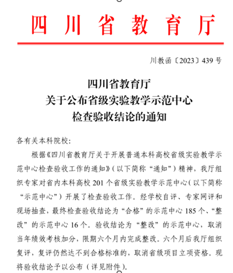 近日,四川省教育厅发布了《关于公布省级实验教学示范中心检查验收结论的通知》(川教函〔2023〕439号),文科综合省级实验教学中心顺利通过省教育厅验收。