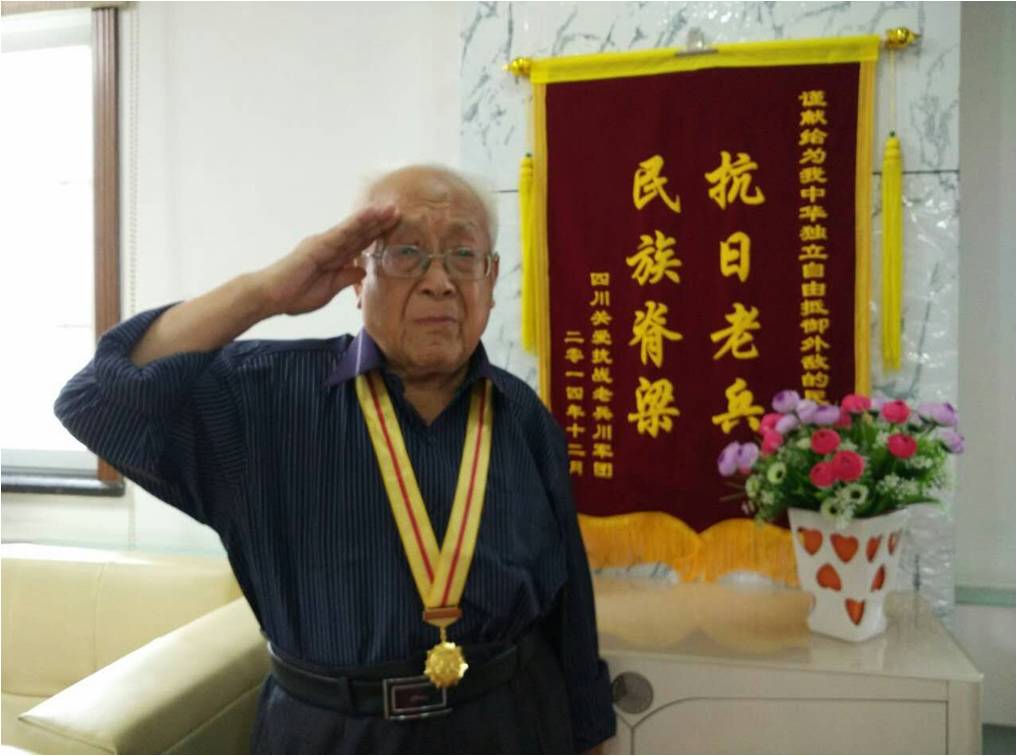 朱明伦老先生在家带上纪念章向抗战老兵敬礼