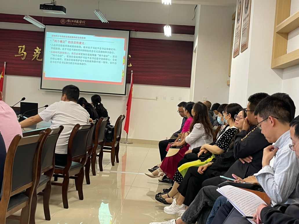 5月22日下午,按照主题教育“学思想、强党性、重实践、建新功”的总要求,学院党委书记邓小明在弘文楼242会议室为全体党员作了一场题为“准确把握马克思主义中国化时代化新境界”的主题党课。