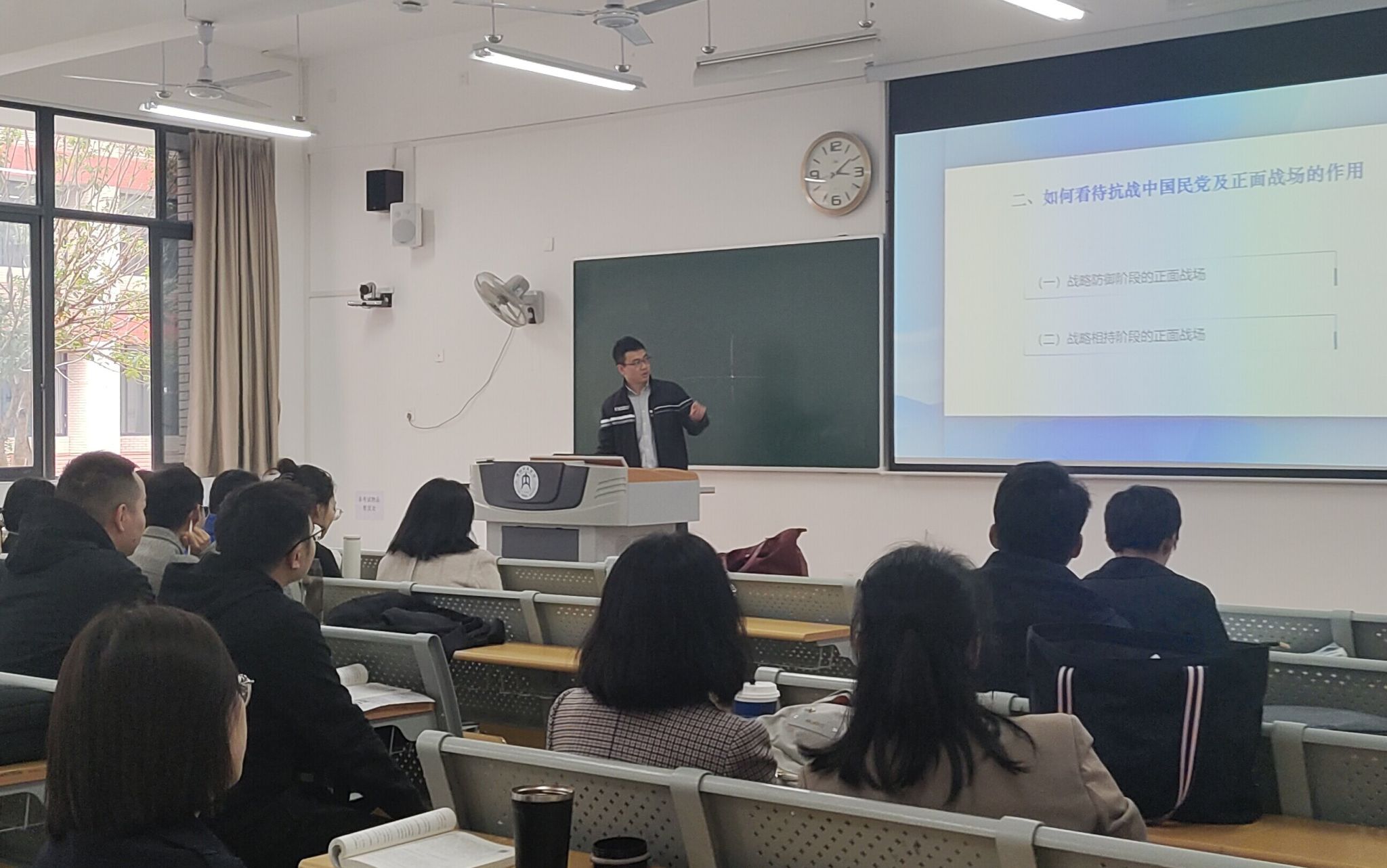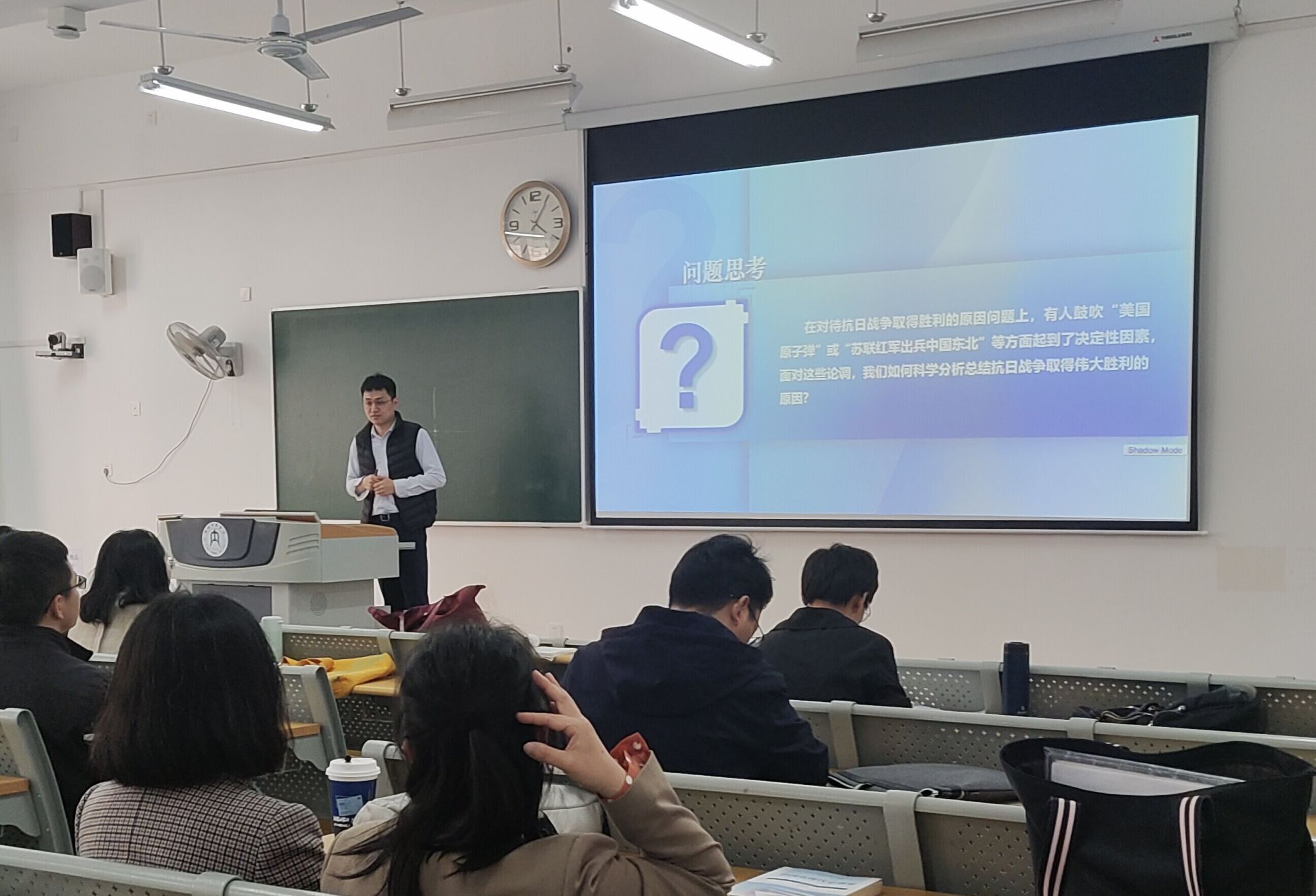 首先,李学兵老师、李雪老师、陈慧老师、宋帝老师、谢凯老师分别进行了说课。五位老师说课的主题分别是“全民族抗战的血肉长城是怎样筑成的”、“如何看待中国国民党抗战及正面战场的作用”、“为什么说中国共产党是中华民族抗日战争的中流砥柱”、“如何理解中国人民抗日战争在世界反法西斯战争中的地位”、“抗日战争胜利的原因和意义”。五位老师的说课思路清晰,资料详实,教学手段丰富,老师们听得聚精会神。