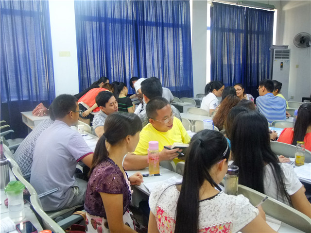 接着李教授把全班学员分为八个小组,每组四人左右,并由组员选举产生本组组长、发言人、记录员、音控员。全员参与式讨论:什么样的的教学模式是可行的?在各小组激烈的讨论后,每小组发言人上台讲述本组的讨论结果。不同小组有着不同的教学模式,这体现在地区教学模式的差异性。