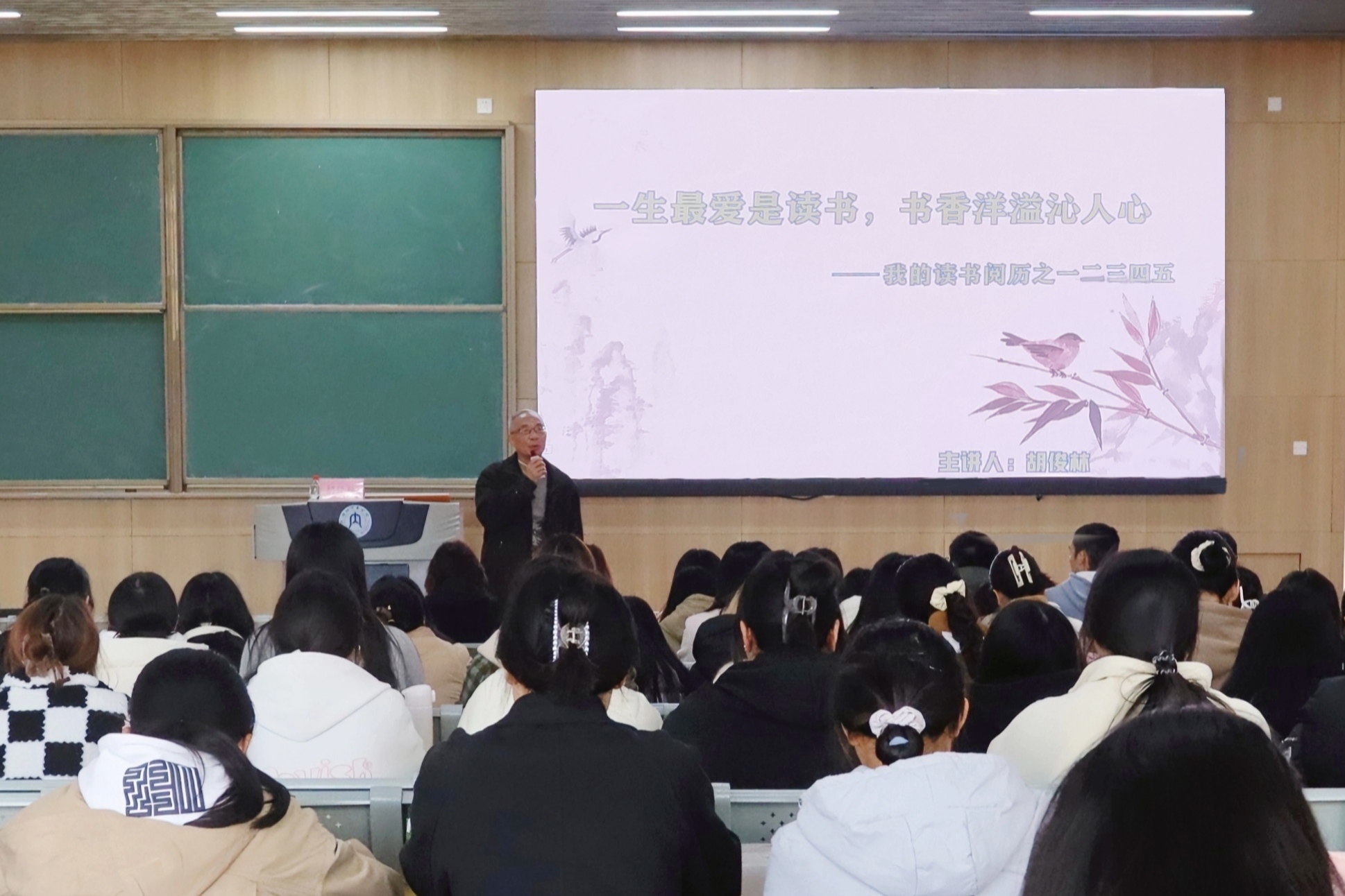 讲座最后,胡教授从结合自身经历,为同学们分享阅读技巧:“三种情境”即知之、好之、乐之;“四项技能”即泛读、略读、精读、笔读;“五个做到”即心到、眼到、耳到、手到、足到。他表示,这些技巧各显其极,希望同学们能灵活运用,融会贯通。讲座中,胡教授语调亲切,语言幽默,充分调动了同学们的阅读热情,现场气氛轻松欢快。