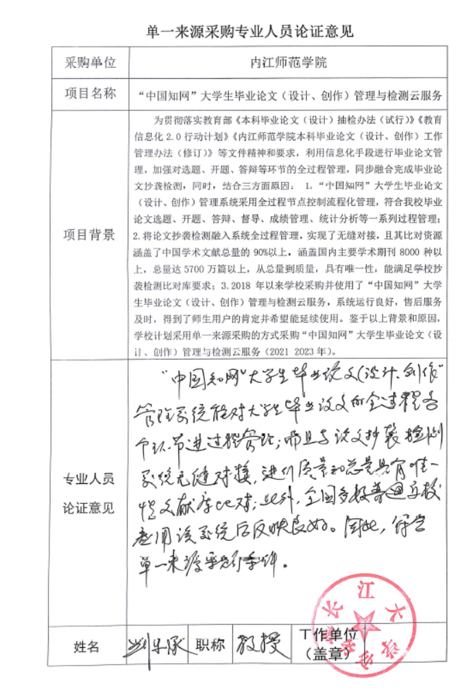 采用单一来源采购方式的原因及说明:1.“中国知网”大学生毕业论文(设计、创作)管理系统采用全过程节点控制流程化管理,符合我校毕业论文选题、开题、答辩、督导、成绩管理、统计分析等一系列过程管理;2.将论文抄袭检测融入系统全过程管理,实现了无缝对接,且其比对资源涵盖了中国学术文献总量的90%以上,涵盖国内主要学术期刊8000种以上,总量达5700万篇以上,从总量到质量,具有唯一性,能满足学校抄袭检测比对库要求;3.2018年以来学校采购并使用了“中国知网”大学生毕业论文(设计、创作)管理与检测云服务,系统运行良好,售后服务及时,得到了师生用户的肯定并希望能延续使用。鉴于以上背景和原因,学校计划采用单一来源采购的方式采购“中国知网”大学生毕业论文(设计、创作)管理与检测云服务(2021-2023年)。