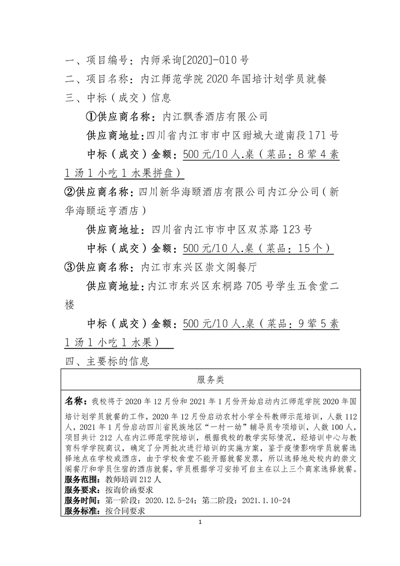 内江师范学院2020年国培计划学员就餐项目中标(成交)结果公告