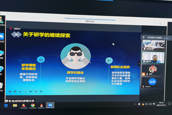 5月12日下午,我校邀请到北师大基础教育合作办学平台小鲸狮项目组运营总监黄玮、北师大实验中学丰台学校副校长桂成伟两位专家,通过视频会议形式,对我校即将开展的中小学研学实践工作进行了指导和培训。会议在第三实验楼召开,参加会议的有我校研学教师、学生、资产公司研学助教等,会议由李丙龙主持。