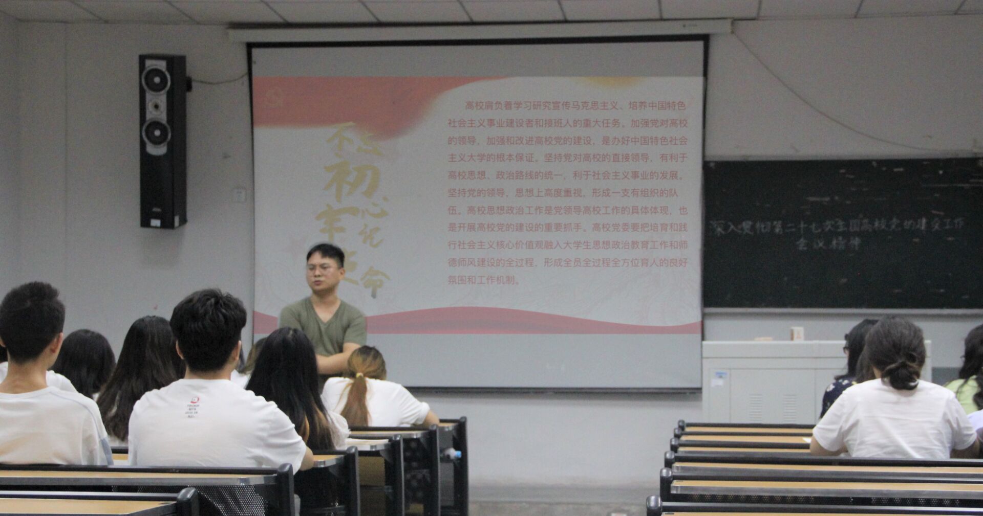 会议伊始,李昌盛老师向同学们传达第二十七次全国高校党的建设工作会议的精神,深入学习贯彻习近平总书记“七一”重要讲话精神和习总书记关于加强高校党建工作的重要论述,是贯彻落实《中国共产党普通高等学校基层组织工作条例》的重要举措,对于指引全国高校奋进新征程,建功新时代具有重要意义,全体学生党员一定要认真学习领会。