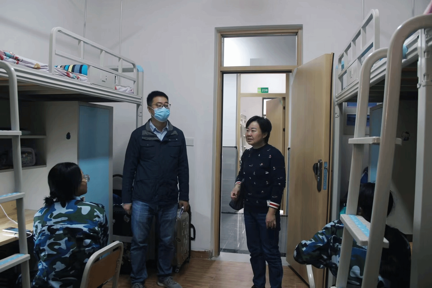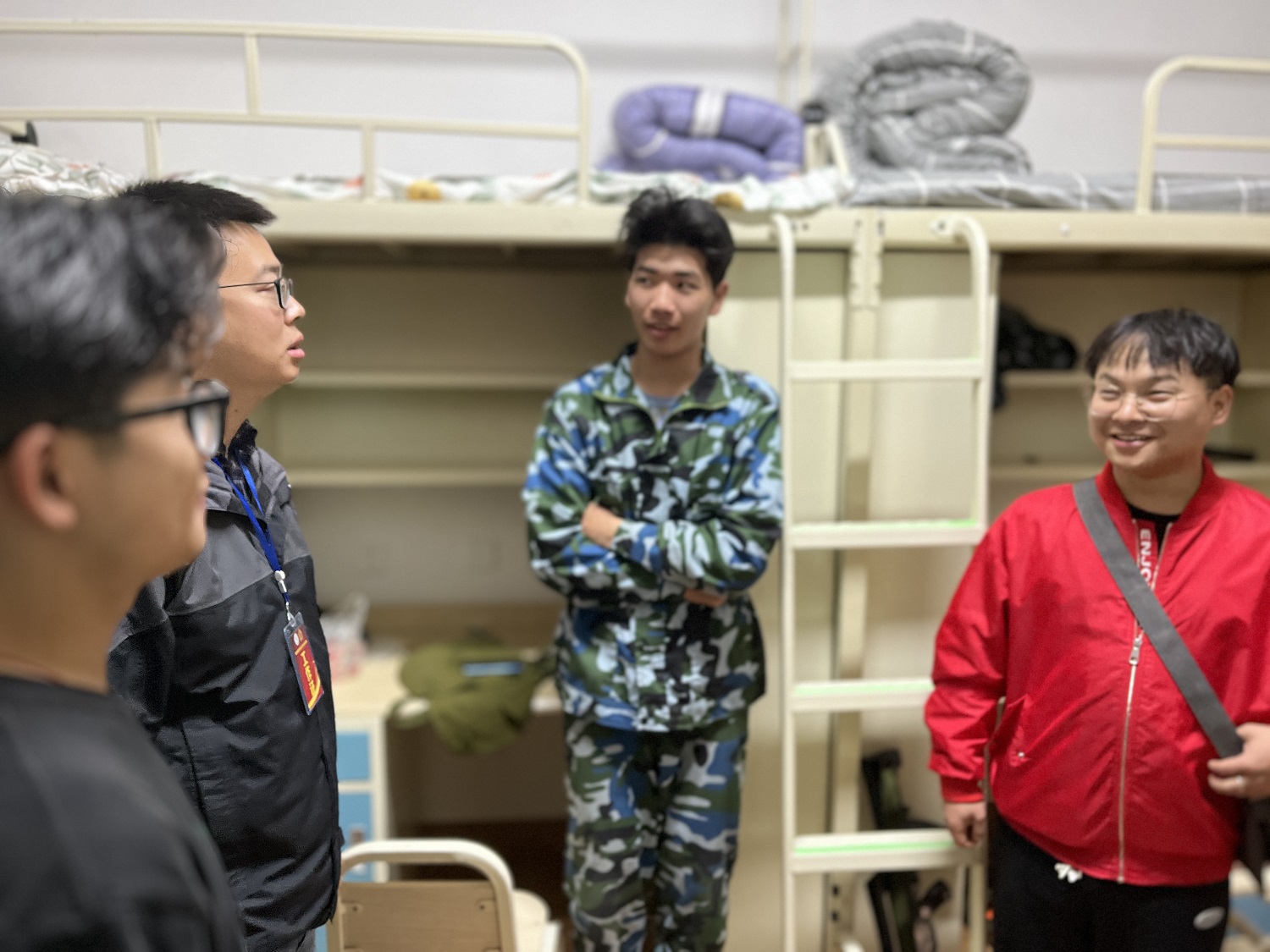 从寝室卫生到仪容仪表,学生表现十分良好,被子叠的豆腐块,地板十分干净,桌面柜子以及私人物品摆放都非常整齐。走访过程中,老师们详细关心询问同学们“学习、生活上还有没有什么困难?”“一定记得开窗通风”……同学们表示基本适应了学校的生活,老师们与同学们亲切交谈,认真聆听每一位学生的需求,耐心解答同学们的困惑。叮嘱同学们遵守宿舍用水用电相关规定,不使用大功率电器,出门关电,注重用电安全,营造一个安全的宿舍环境。勉励同学们养成健康文明、积极向上的生活习惯,以充实饱满的精神风貌过好大学生活的每一天。
