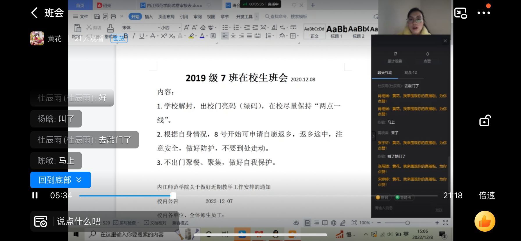 会上,彭书记首先介绍了近期国家、省市疫情防控相关政策,传达了近期学校召开的有关学生工作会议精神。彭书记强调,各班要按要求,组织好线上线下的教学,提醒学生做好期末考试、考核等工作。对自愿申请返乡的学生,要仔细审核学生返乡申请材料,与家长保持密切联系,确保学生点对点顺利返乡。各班要加强学生安全教育,春运将至,同学们返乡要做好行程规划,错峰出行。最后,彭书记还强调了毕业班就业问题,要求各班进一步做好毕业生就业帮扶和指导工作,确保毕业生高质量就业。