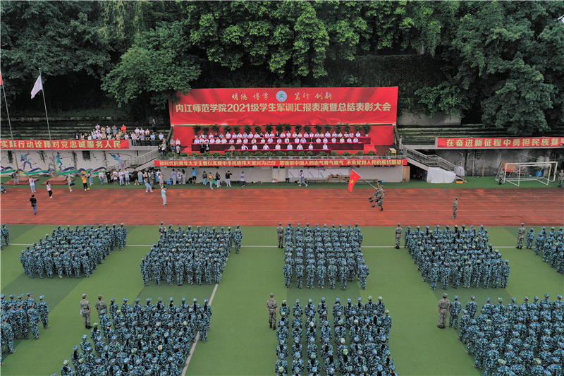 表演结束后,新生军训团团长作了军训总结。学校领导李益彬副校长宣读了军训先进集体与个人的表彰决定。获奖集体的营连长和先进个人代表先后在主席台领取了奖牌和证书。校党委副书记黄辉发言指出,学生军训是全面贯彻落实党的教育方针、新时代军事战略方针和总体国家安全观,培养德智体美劳全面发展的社会主义建设者和接班人的战略工程,学校历来高度重视国防教育工作的开展,坚持把军训作为新生入校的第一课,把国防教育作为强化学生素质教育的重要环节和手段。寄语新生们牢记“明德、博学、笃行、创新”的校训,传承和发扬“负重自强、团结奋进”的内师精神,怀揣勇气与梦想,只争朝夕,不负韶华,以自立自强的勇气,成为有理想、有本领、有担当的中华民族伟大复兴之路上的追梦人。