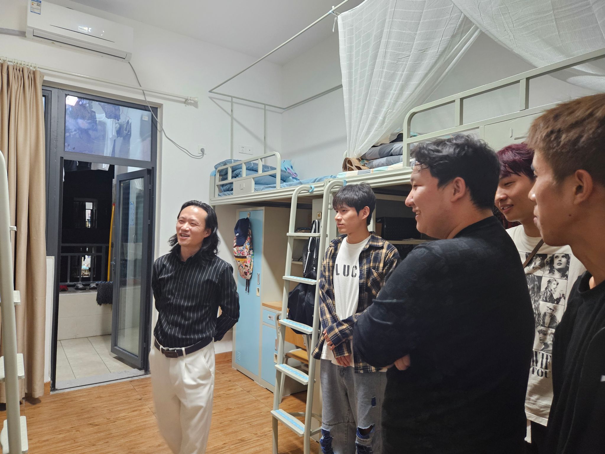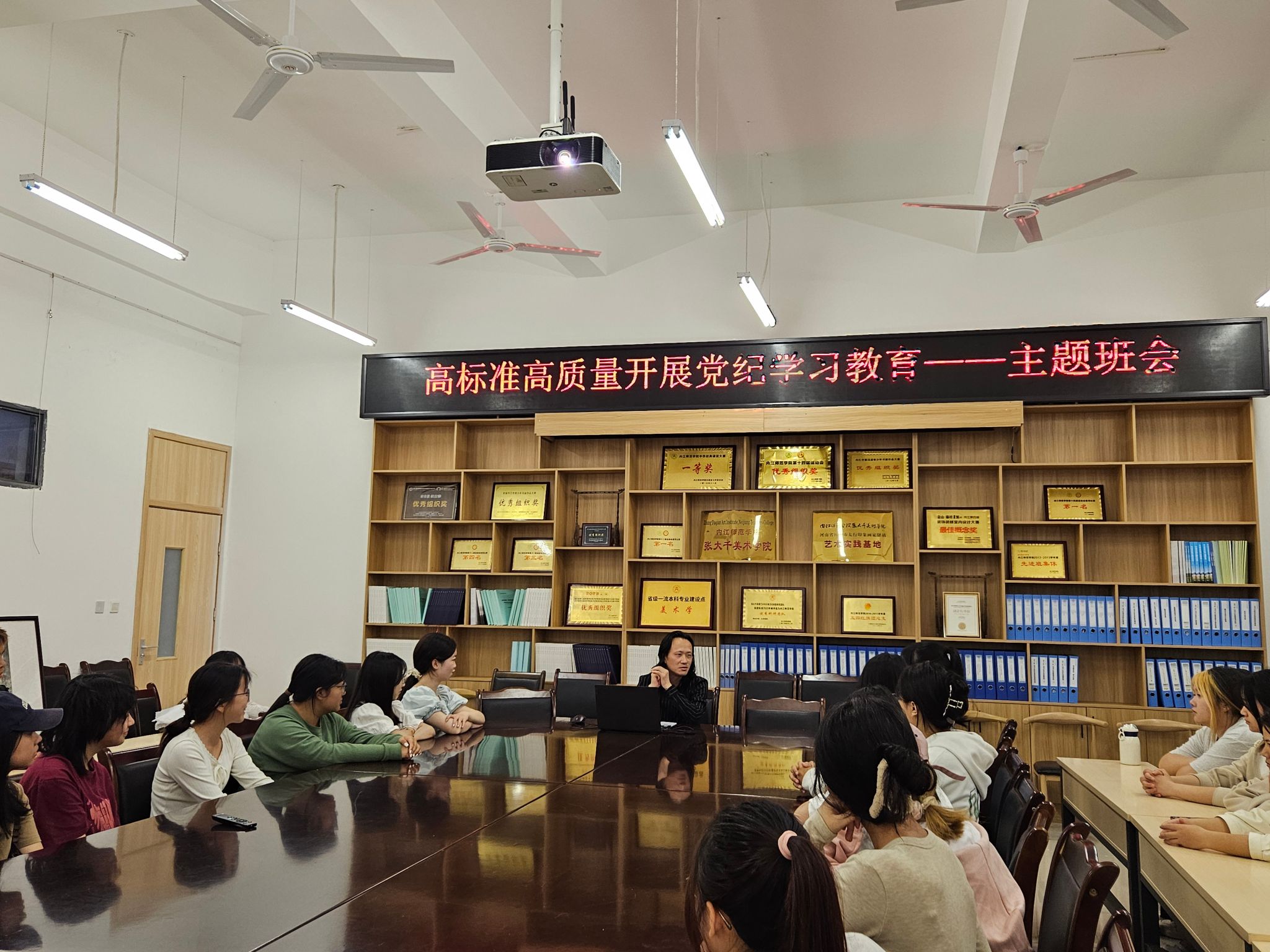 活动伊始,罗院长组织开展主题班会,就党纪学习教育的背景和目的展开说明,罗院长强调:要加强组织领导,采取多种学习方法,利用现代信息技术手段,结合实际案例开展学习,切实推动党纪学习教育制度化、规范化、常态化。紧接着,罗院长结合同学们在校的学习生活实际与同大家展开讨论,罗院长深入分析了专业水平羸弱与就业环境、职业发展前景的利害关系,在听取学生们的反馈意见后,罗院长鼓励并警示2023级4班的同学们要走出舒适区,在认真刻苦钻研专业水平技术的同时,不断拓宽个人理论知识的广度深度,鼓励同学们正向发展,向高处走。罗院长在讲座中强调,作为美育工作者要把对美术教育的热情贯彻到今后生活的每一天,笔耕不断,用自己过硬的专业技术去讲好每一堂课,站好每一班岗,争做学生们美育教育的引路人,不负自己,不负学生,不负社会。最后,罗院长走进大千苑18-3学生寝室,实地查看了解同学们的生活环境,并叮嘱同学们讲文明,讲卫生,注意寝室卫生,共同营造干净整洁的生活学习环境,展现美院学子的良好精神面貌。