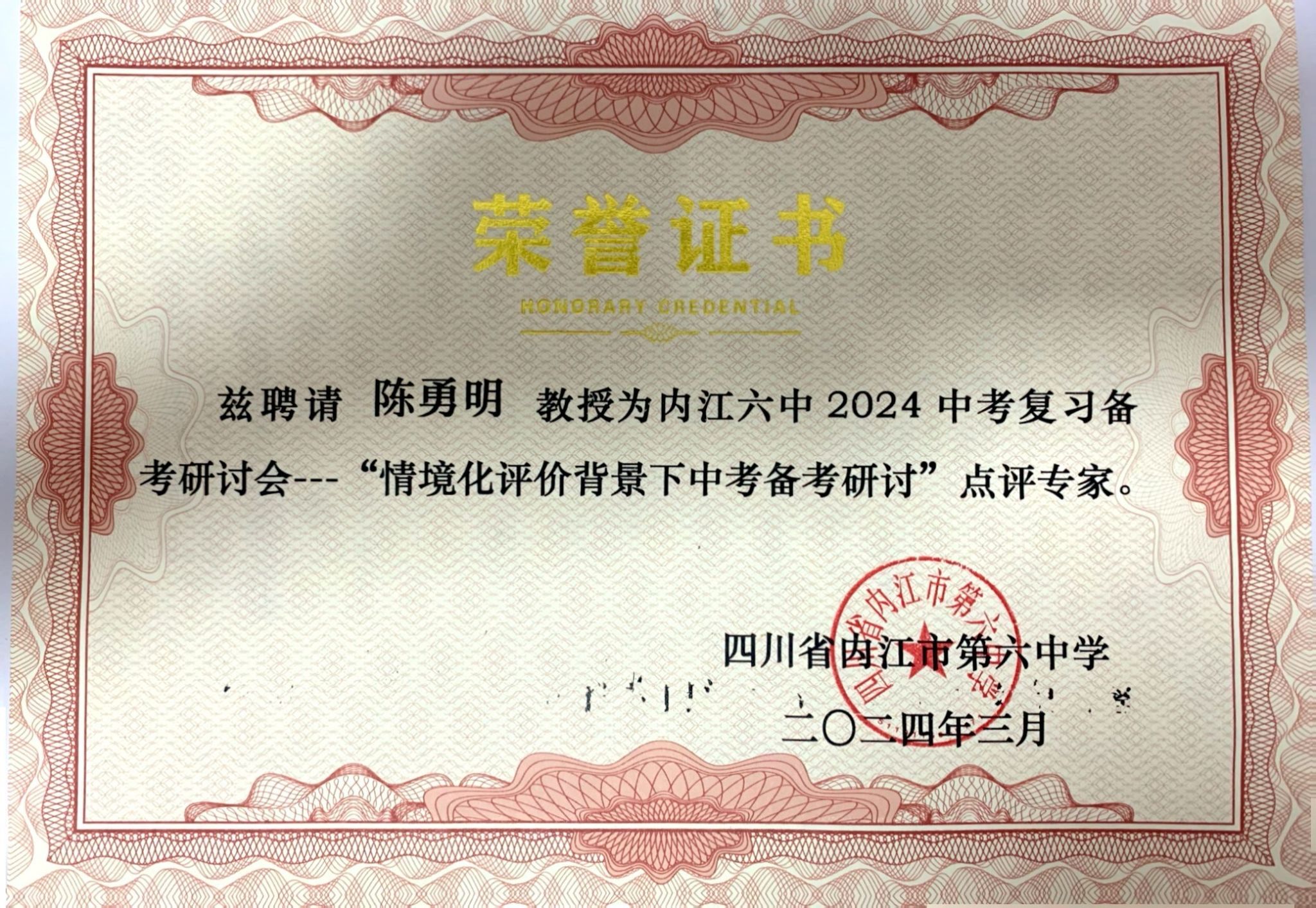 2024年3月21日,内江六中联盟校2024年“情境化评价下中考复习研讨会”如期举行,我院实践实训教研室陈勇明副教授作为特邀专家参会。