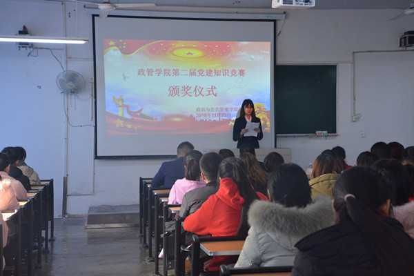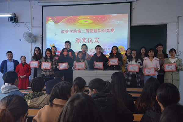 11月23日上午12点30分,政治与公共管理学院学生党支部于一教305隆重举行党建知识竞赛颁奖仪式。参加本次颁奖仪式的有党总支书记谭化容老师、党总支副书记康超老师、彭春霞老师、孟发兵老师,参赛的所有党员同志以及学生党支部成员,本次颁奖仪式由学生党支部纪检部干事曾颜主持。